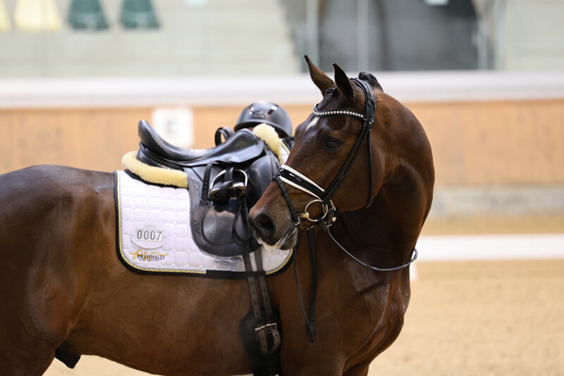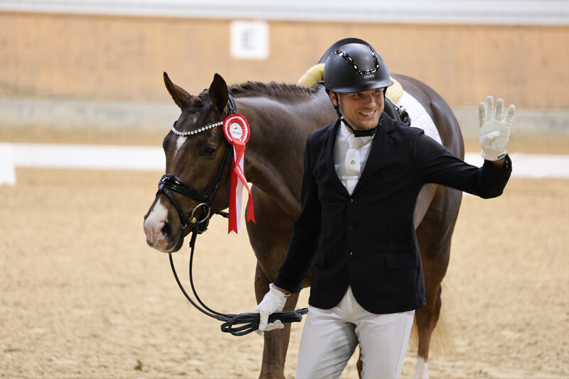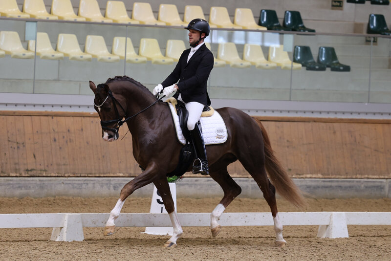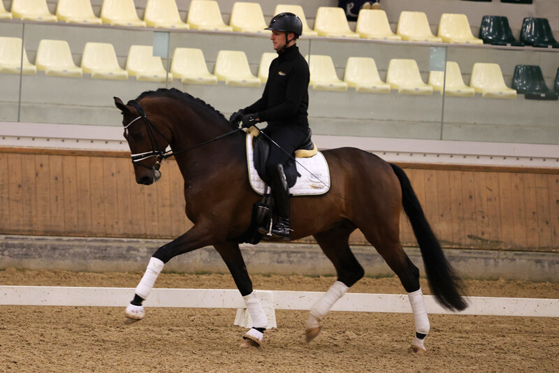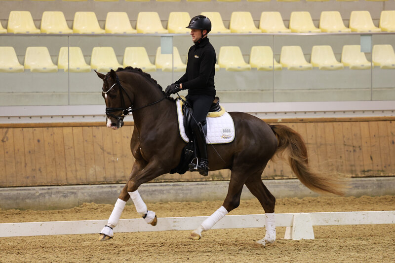 Er präsentiert sich unter dem Sattel, wie bereits bei seiner Prämierung und Körung, mit ausdrucksstarken, durch den Körper schwingenden Grundgangarten, die mit Noten bis 9,0 für Trab & Galopp belohnt wurden. Auch in Sachen Rittigkeit und Gesamteindruck ließ er keine Wünsche offen. Fremdreiterin Julia Strilka vergab die Tageshöchstnote von 9,0, für den Gesamteindruck gab es die 8,5.